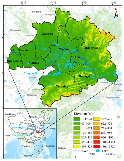 WUAA is located at 112°30′ E–116°07′ E, 29°05′ N–31°51′ N in central China, the middle reaches of the Yangtze River, and the eastern part of Hubei Province. WUAA covers nine cities, including Ezhou, Huanggang, Xiaogan, Xianning, Xiantao, Qianjiang, and Tianmen (Figure 1). It is the largest urban area in the middle reaches of the Yangtze River and the most industrial-intensive area in Hubei Province. By the end of 2019, the total area of the WUAA reached 57,943.917 km2, accounting for 31.34% of the province’s total area. The permanent population was 31.925 million, accounting for 53.86% of the province’s permanent population. The total GDP was CNY 2768 billion, or 60.4% of Hubei’s GDP. WUAA has undergone significant changes, notably a significant decrease in cultivated land area and a large expansion of construction land. Land development intensity reached 7.24%, far exceeding the 4.62% benchmark set for 2030. However, land-use efficiency is low, rapid economic development takes place at the cost of ecosystem destruction, and the degree of sustainable use needs to be strengthened.