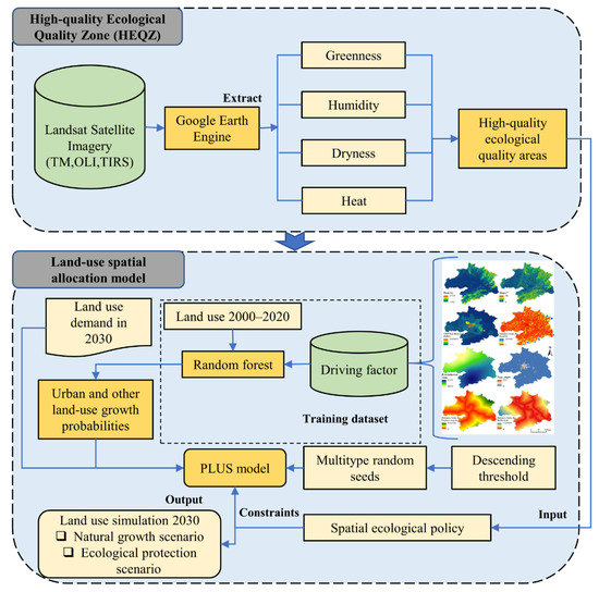 Current land-use and ecological protection models do not fully consider regional ecological security when simulating future land-use patterns. Most of the previous studies have directly selected nature reserves and rivers as the spatial restriction areas of ecological protection, thereby ignoring the role of ecosystem services and landscape integrity in maintaining ecological security. The latter can be defined as the state of the ecological environment that ensures the safety of human life and production as well as the ability to adapt to environmental change. This research assumes that high ecological quality zones (HEQZ) are an effective way to ensure ecological security. Biological movements and ecosystem service flow and transport play a key role in overall ecosystem health and are critical to regional ecological security.