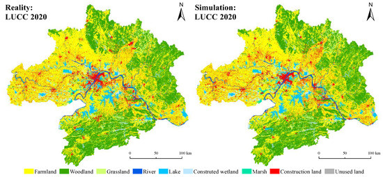 The kappa coefficient was used to assess the performance of the PLUS model. Kappa coefficients between 0.6 and 0.8 indicate a high degree of simulation agreement, while 0.8 and 1.0 indicate near-perfect agreement. Taking the land-use data in 2010 as the initial state, the PLUS model predicts land uses in 2020. By comparing actual land-use images for 2020 with the predicted land uses (Figure 4), it was found that the overall accuracy of the simulation was 81.42%, and the individual accuracies for farmland, woodland, and wetlands were all higher than 80%. The PLUS model applied to the WUAA has a high simulation accuracy and therefore is also highly reliable for predicting future land-use changes using validated parameters.