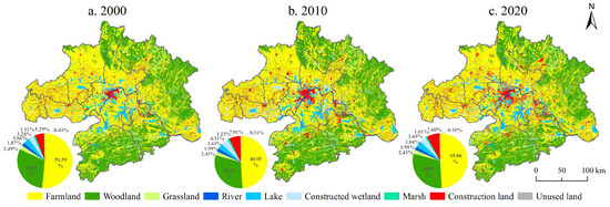 Based on China’s policy of ecological civilization construction, urban development strategy, permanent essential farmland protection, rigid constraints of construction land control, and other factors, various landscape elements interact and flow in the WUAA. Among them, the scale of cultivated land and construction land has changed dramatically. In the 21st century, the national strategy of urbanization issued a series of policy documents on the coordinated development of significant regions. Such policies promote the development of Wuhan, from the surrounding city to the city center, and thoroughly leverage the advantages of resources agglomeration, radiating and driving efficiency from the city center. The construction of the Optical Valley technology corridor has accelerated the rapid expansion of construction land in Wuhan and Ezhou, occupying a large amount of arable land and woodland. In response to policy requirements, the expansion rate of construction land in the WUAA has slowed down. Since 2002, Hubei province has fully implemented the policy of returning farmland to woodland and grassland, resulting in a net outflow of cultivated land, as manifested by the expansion of woodland and constructed wetland. In 2005, the General Office of the State Council issued the Measures for the Assessment of Cultivated Land Protection Responsibility Targets of Provincial Governments, requiring that cultivated land ownership and protected areas of bare farmland be assessed every five years in each province.