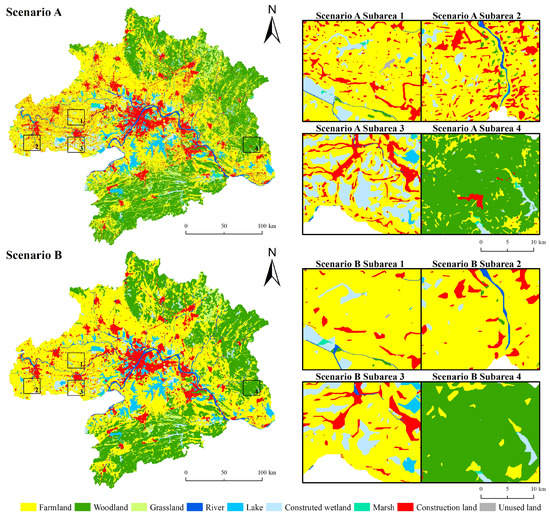 Figure 8 displays land-use patterns for the two scenarios (NG: natural growth; EP: ecological protection) in 2030. In both cases, construction land in the WUAA is mainly distributed in Wuhan, Ezhou, and Huanggang. Forests are concentrated in the south and northeast, and cropland is widely distributed in the west and cities surrounding Wuhan. Under the NG scenario, cropland, woodland, rivers, artificial wetlands, marsh wetlands, and construction land in the environmental protection area amount to 6589, 21,553, 235, 3277, 2865, and 5865 km2, respectively. Under the EP scenario, the HEQZ protects additional 580 km2 of woodland, 624 km2 of marsh wetlands, and 235 km2 of rivers.