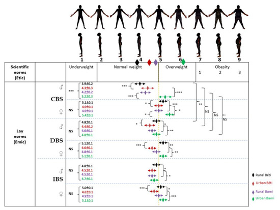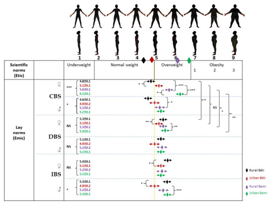 Among women, perceptions of themselves (CBS means) were overall oriented toward an overestimation in Béti and an underestimation in Bamiléké in terms of actual body size (BMI means). Only rural Béti men overestimated their partner’s body size, while a body size underestimation was observed in Bamiléké groups. Women have shown DBS and IBS means in the overweight category. However, we observed that only urban Béti men mainly wanted their partner (DBS) to be of normal weight and idealized the opposite sex (IBS) in this bodyweight category. The other groups had both DBS and IBS means in the overweight category.