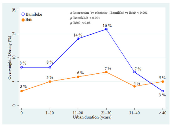 Adjusted by age, we observed significant associations between overweight/obesity and the length of residence in the urban area for both Bamiléké (p < 0.001) and Béti (p < 0.05) (Figure 3). A difference between Bamiléké and Béti in the association between overweight/obesity and the length of residence in the urban area was also observed (p < 0.001). Before the starting conditions of urban residence (year 0), the Bamiléké showed a higher prevalence of overweight/obesity (8%) than Béti (3%). Between 1–10 years of urban residence, the prevalence of overweight/obesity was 5% in Béti and 8% in Bamiléké. At 10 years and at up to 30 years of urban residence, this prevalence marginally increased in Béti (from 6 to 7%) while it increased sharply in Bamiléké (from 14 to 16%). After 30 years of urban residence, we observed a pronounced decrease in both groups, with the effect of age adjustment, whilst the prevalence remained higher in Bamiléké (7 vs. 4%). Finally, after 30 years of urban residence, the prevalence of overweight/obesity were low and quite similar in both groups.
