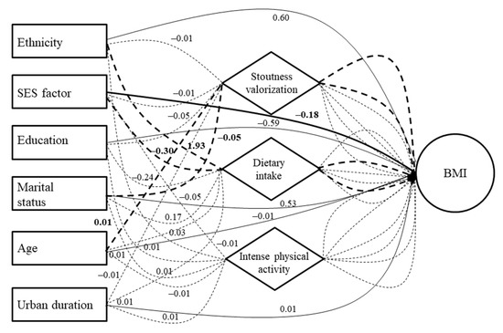 Concerning the significant direct effects in men (Table S1), stoutness valorization and dietary intake predictors were positively associated with BMI, whereas the SES predictor (in an inverted direction) was negatively associated (Figure 4). Concerning the significant indirect effects in men (Table S2), the ethnicity predictor was found to be positively associated with BMI through dietary intake—whereas a negative BMI association was found for the SES predictor, again through dietary intake (Figure 4). The age predictor was then found to be positively associated with BMI through stoutness valorization, while a negative association was found for the marital status predictor, again through stoutness valorization.