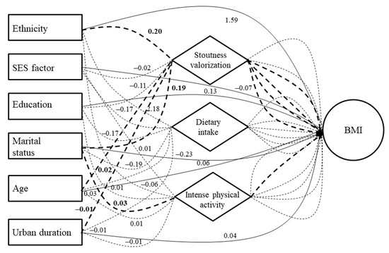 Concerning the significant direct effects in women (Table S1), the stoutness valorization predictor was found to be positively associated with BMI (Figure 5). Concerning the significant indirect effects in women (Table S2), ethnicity, age, and marital status predictors were found to be positively associated with BMI through stoutness valorization. The last predictor was also positively associated with BMI through intense physical activity. Finally, the urban residence duration predictor was found to be positively associated with BMI, again through stoutness valorization (Figure 5).
