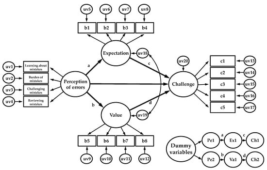 The data collected in this study were processed using Jamovi 2.0 (IBM, New York, NY, USA) and AMOS 23.0 (IBM, New York, NY, USA), and the significance level was set to 0.05. Frequency analysis was performed to investigate demographic characteristics, and the CFA and Cronbach’s ɑ coefficient were calculated to examine the validity and reliability of the scales. Furthermore, the basic assumption of normality (skewness ± 3, kurtosis ± 7) [] was reviewed prior to the SEM, and the hypothesis was verified by sequentially reviewing the measurement and structural models. Correlation analysis was performed to verify the discriminant validity of the perception of errors (learning about mistakes, the burden of mistakes, challenging mistakes, reviewing mistakes), expectation (expectation for success), value (subjective values), and challenge. All correlation coefficients were judged to not overlap the concept of variables when the multicollinearity criterion was less than 0.80 []. The bootstrap [] method was used to verify whether the indirect effect (mediation effect) of the expectancy value in the relationship between perception of error and sense of challenge was statistically significant. At this time, 2000 repetitions were conducted, and statistical significance was confirmed at a bias-corrected 95% confidence interval. Since the mediation effect established in this study corresponds to a multiple mediation model, each indirect effect must be estimated separately. However, only the bootstrapping of the AMOS total indirect effect is presented as an estimate []. In order to solve this, the Phantom Model approach was applied as follows: the Phantom Model includes phantom variables in the model to estimate indirect effects and restricts the non-standardized coefficients of the original model to be the same as those of the Phantom Model so that the total effect of this model can be estimated as the indirect effect of the original model (Figure 1). Furthermore, the coefficients of the original model are fixed even if they are converted to the Phantom Model. Hence, even if the Phantom Model is input to the set path model, the fit indices of χ2, df, TLI, CFI, RMSEA, and SRMR are equally calculated []. For the statistical significance of the mediation effects, the bootstrapping method with a bias-corrected 95% confidence interval was applied [], and a Phantom Model was established to estimate individual indirect effects [].