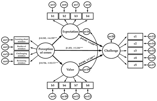 In order to test our hypothesis regarding the causal relationship between perception of error, expectancy value, and challenge, a statistical model with the perception of error as an exogenous variable, expectancy value as an endogenous variable, and challenge as an endogenous and final dependent variable, was constructed (Figure 2), and structural model validation was conducted (Table 6). The fit indices of the model were subsequently as follows: χ2 = 238.885, df = 0.98, TLI = 0.959, CFI = 0.966, RMSEA = 0.058, and SRMR = 0.052, indicating that the fit criteria were met []. The specific hypothesis test results were as follows: an examination of the effect of perception of error on expectancy revealed that perception of error had a significant positive effect on expectancy (β = 0.385, p < 0.001). Examination of the effect of perception of error on value revealed that perception of error had a significant positive effect on value (β = 0.706, p < 0.001). Examination of the effect of perception of error on challenge revealed that perception of error had a significant positive effect on challenge (β = 0.367, p < 0.001). Examining the result of expectancy and value on challenge revealed that both expectancy and value had significant effects on the challenge (β = 0.147, p < 0.001) (β = 0.460, p < 0.001), respectively.