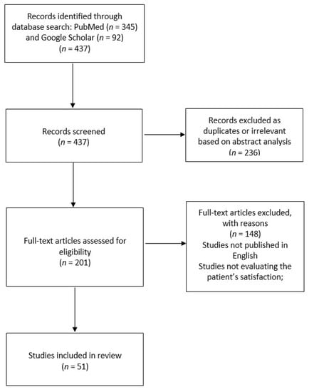 In August 2021, we searched PubMed and Google Scholar online databases for the following search terms: “telemedicine”, “teleconsultation”, “telehealth” in combination with “patient’s satisfaction”, “patient’s perspective”, “patient’s experience”. We did not search MEDLINE as we wanted to avoid duplicating papers already identified in PubMed and Google Scholar. We found a total of 437 articles in PubMed and Google Scholar. Then, we consecutively screened abstracts and full-text articles which assessed patient satisfaction during the COVID-19 pandemic. We excluded articles which did not meet inclusion and exclusion criteria. The inclusion criteria were as follows: survey studies including adults, original studies published between January 2020 and August 2021, studies published in English. The exclusion criteria were as follows: studies published before January 2020, systematic reviews and meta-analyses, studies that did not evaluate patient satisfaction (Figure 1). Finally, 53 papers were analysed in this review.