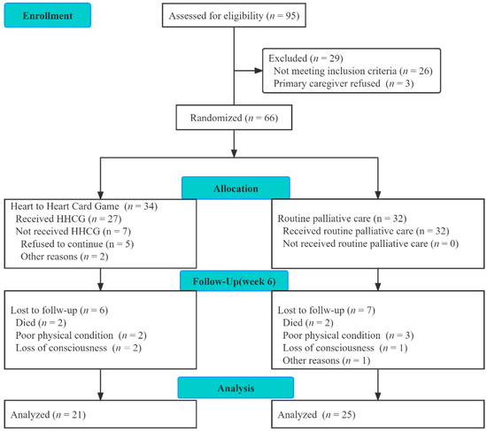 Li et al. [23] used the HHCG to investigate the preferences of Chinese cancer patients, and found that more than 70% of the participants highly valued the HHCG. Liu et al. [24] used the HHCG on 17 patients with malignant tumors in the oncology department, and compared them with their counterparts who received usual care. The results showed that palliative care guided by the HHCG can relieve cancer patients’ anxiety and depression, and improve their sense of dignity. He et al. [25] also found that the HHCG can improve the death-related attitudes of hospitalized patients with advanced cancer and effectively reduce their negative emotions of anxiety and depression. However, in the Eastern culture, patients with advanced cancer are more likely to receive palliative care at home [26]. The effects of the HHCG for patients with advanced cancer receiving home-based palliative care must therefore be explored.