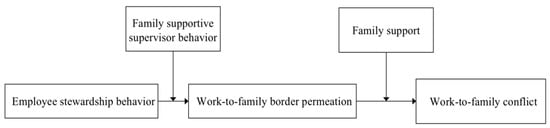 Boundary penetration can be classified into three types: physical, temporal, and psychological penetration []. Physical penetration refers to work (or family) matters or people entering the home (or work) space, whereas temporal penetration refers to work (or family) time requiring home (or work) time. Psychological penetration mostly refers to emotional or attitudinal spillover and the migration of ideas and skills. High-permeability boundaries allow the aspects of a person’s characteristic behaviors and expressions to spill over into another life area []. In addition, permeability can indicate that an individual’s current role allows them to be in one area when their mind is focused elsewhere (i.e., to be absent of mind, this is thinking about home while at work or thinking about work while at home) []. Work penetration into the home (e.g., working from home, taking work home, work-related contacts at home, and work–family multitasking) was associated with work–family conflict and stress []. According to the above analysis, individuals with stewardship behaviors are more likely to experience objective versus subjective work–family penetration, and work–family penetration exacerbates work–family conflict [,,]. Therefore, the following hypothesis was constructed: