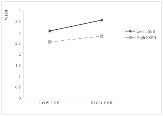 The data analysis results of Model 4 in Table 3 show that the interaction term between ESB and FSSB has a significant negative effect on WFBP (β = −0.149, p < 0.01), which is inconsistent with the direction of ESB’s effect on WFBP (β = 0.367, p < 0.001). Therefore, under the moderation of FSSB, the effect of ESB on EFBP was reduced (β = 0.321, p < 0.001). Hypothesis 3a is supported.