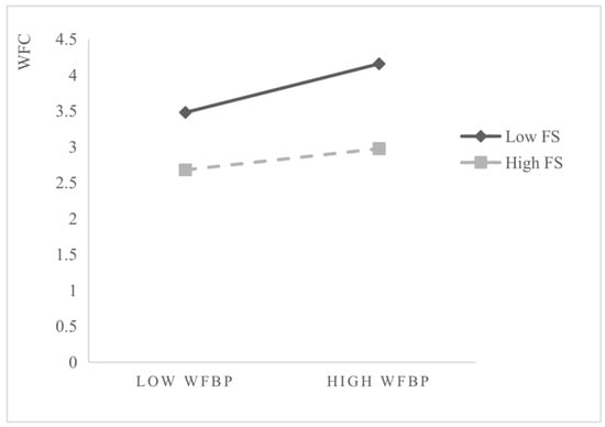 According to the data analysis results of Model 7 in Table 3, the interaction term between WFBP and family support can significantly negatively affect employees’ WFC (β = −0.241, p < 0.001), which is inconsistent with the direction in which WFBP affects employees’ WFC (β = 0.416, p < 0.001). Therefore, under the moderating effect of family support, the effect of WFBP on employee WFC was weakened (β = 0.37, p < 0.001). Hypothesis 3b is supported.