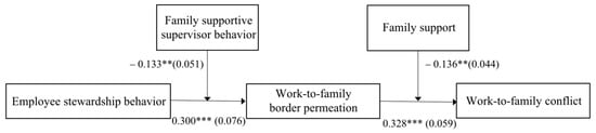 Family-supportive supervisors set an example of fulfilling family responsibilities by sharing techniques they use for balancing work and family life with their subordinates [] and supporting employees in their family responsibilities. As such, stewardship employees can perceive the organization’s support of their own families. They are willing to restrict the penetration of work into their families when responding to their supervisors’ requests. Conversely, when the degree of FSSB in the organization is low, employees with a tendency toward stewardship behaviors are willing to assume more work responsibilities. ESB leads to higher willingness toward and increased work–family penetration. Based on the above analysis, we propose the following hypothesis: