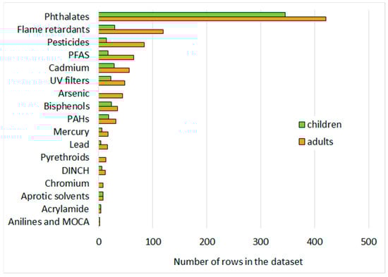 The dataset includes biomarkers for plasticizers (i.e., phthalates, di-isononyl cyclohexane-1,2-dicarboxylate (DINCH)), pesticides (i.e., pyrethroids, organophosphates, carbamates), poly- and perfluoroalkyl substances (PFAS), flame retardants, cadmium, arsenic, mercury, chromium, lead, polycyclic aromatic hydrocarbons (PAHs), bisphenols, benzophenones, acrylamide, mycotoxins, anilines, and 4,4′-Methylene-bis(2-chloroaniline) (MOCA). An overview of the substance groups’ representation in the dataset is shown in Figure 1. Phthalates is the substance group with most records across data collections, followed by flame retardants, PFAS, pesticides (mostly organophosphates) and cadmium.