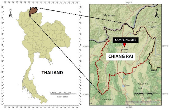 The PM2.5 sampling site is at Mae Fah Luang University, 445 m above sea level (20°02′25″ N, 99°53′25″ E), and far from the industrial zone and main road. The sampling location is an open field of the university. This site is in Chiang Rai Province, with a population of 1.29 million in a total area of 11,678 square kilometers. Chiang Rai is in the northernmost part of Thailand; most areas are mountainous, with a flat terrain of agricultural areas between the mountains. This province is located and connected to Myanmar (Burma) and Laos. The location of the sampling area is illustrated in Figure 1.