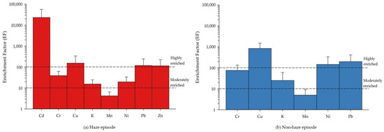 Enrichment factors (EFs) of various elements were estimated using Equation (2). EF was used for identifying the enrichment of particulate elements either from crustal or anthropogenic origin. EF is the representation of the concentration ratio of the concerning heavy metal in particles to Fe in aerosols, and the average concentration of the heavy metal divided by the concentration of Fe in crust represents the corresponding heavy metal concentrations to Fe ratio in crustal matter per sample weight (mg/kg). Table 1 shows the concentration of heavy metal per volume of airmass (ng/m3). The estimated values of EFs during both the haze (a) and non-haze (b) episode are illustrated in Figure 2. EFs for the non-haze period were higher (at lower mass concentrations) than the haze period (when mass concentrations are higher); this might be due to the fact that the level of target elements detected in both periods are not much different, but the reference elements in the haze period are much higher than non-haze period, so the ratio of the (Cx/Cref) sample was greater, and led to the higher EF value in the non-haze period. The average EF values of the element in PM2.5 in haze and non-haze episodes are presented in Figure 2. In this study, the EF values of Cd, Cu, Ni, Pb, and Zn are highly enriched (over 100), showing that these elements are more likely to be emitted from anthropogenic sources. Cd had the highest EF value in haze episodes (approximately 23,000), which indicates that this element was weakly related to the crustal source, and mainly originated from anthropogenic sources, e.g., the metallurgical industry and waste incineration; this corresponds to Kayee et al., 2020 [36], who reported that the EF values were related to the sources of PM. An EF higher than 100 indicates the influence of strong anthropogenic sources. An EF greater than 10 indicates a moderate influence of anthropogenic sources. The elements with EF values between 10 to 100 include Cr and K, indicating that they are moderately enriched, and the source of these elements is anthropogenic. The EF value of Mn is below 10, indicating that this metal was not enriched and mainly originated from natural sources, such as re-suspended soil, natural rock weathering, and dust storms.