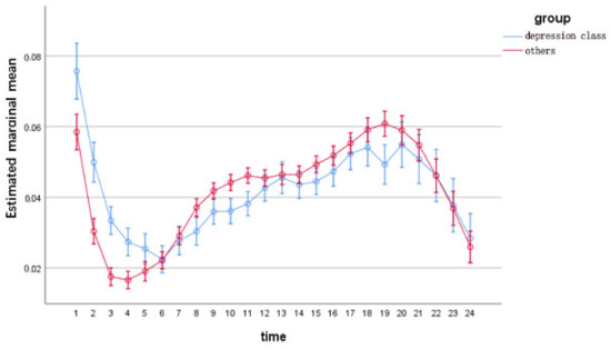The first is about the frequency of user postings per hour. The main difference is that depression class is most active in the early morning and peaks at 0:00. Internet activities late at night are a known behavioral feature of patients with depression [16]; the underlying reason is that they often have sleep disturbances. Chronic insomnia is a prodromal symptom for the development of major depressive disorder, and in Lustberg’s study, it was shown that eight out of every ten depressed patients experience an exacerbation of symptoms at night [45].