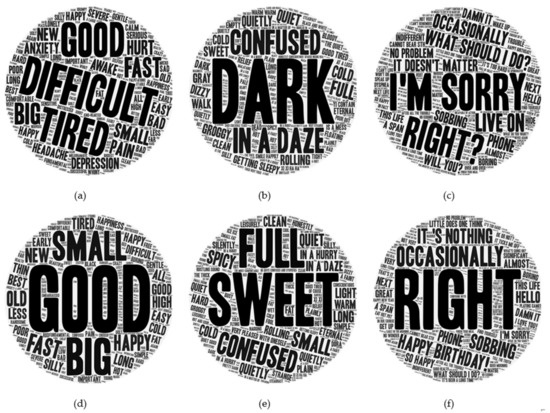Adjectives, descriptive words, and idiom word clouds: (a) The word cloud of adjectives for depression class; (b) The word cloud of descriptive words for depression class; (c) The word cloud of idioms for depression class; (d) The word cloud of adjectives for others; (e) The word cloud of descriptive words for others; (f) The word cloud of idioms for others.