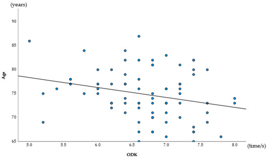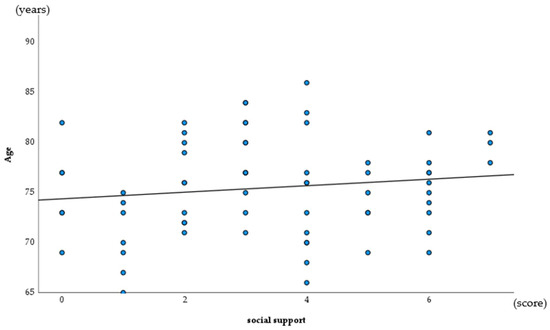 The results of a Spearman’s correlation analysis revealed a significant association for age and ODK (rs = −0.262, p = 0.018), and for social support (rs = −0.219, p = 0.049) (Table 2, Figure 2 and Figure 3).