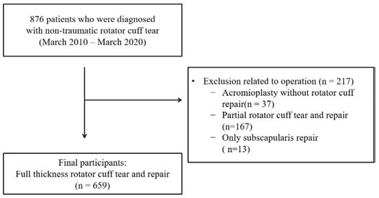 We conducted a retrospective study of 876 Korean adult patients diagnosed with non-traumatic rotator cuff tears (International Statistical Classification of Diseases and Related Health Problems 10th Revision code: M75.1) and underwent surgical treatment between March 2010 and March 2020. In patients with symptomatic rotator cuff rupture, surgical treatment was performed for those who did not improve after conservative treatment such as drug treatment, subacromial steroid injection, and physical therapy for at least 3–6 months. A traumatic tear was considered a traumatic event when there was a definite trauma history to the shoulder joint and magnetic resonance imaging (MRI) revealed a signal change suggesting trauma, such as a bone bruise, hemarthrosis, and edema in the rotator cuff tendon or muscle []. Debridement, synovectomy, and bursectomy were performed for less than 50% of rotator partial tears during surgery, and acromioplasty was performed for bursal-side tears with acromial spur and coracoacromial ligament fraying. For more than 50% of partial rotator tears, rotator cuff repair was performed after complete full-tear conversion [].