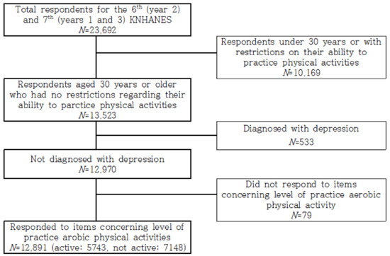 Among all participants (n = 23,692) included in the years targeted for this study, 12,891 were aged 30 or older, did not have any restrictions regarding their ability to practice in physical activity, had never been diagnosed with depression, and had provided details regarding their practice in aerobic physical activity (of these, 7148 adults said they did not practice in any physical activity and 5743 said they did; Figure 1).