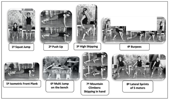 The exercises and the development thereof were designed to be performed in a reduced space, in accordance with the dimensions of a private home. All participants were asked to perform the exercises at a high intensity, by increasing the execution speed during the 20 s of each workout interval. Intensity was monitored individually using heart-rate monitors and a subjective perception of effort scale.