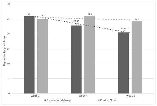 Measurement of depressive symptoms for EG and CG during experimental phase. ** = p < 0.05 vs. week 1.