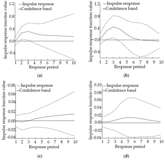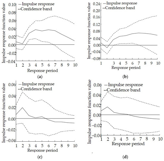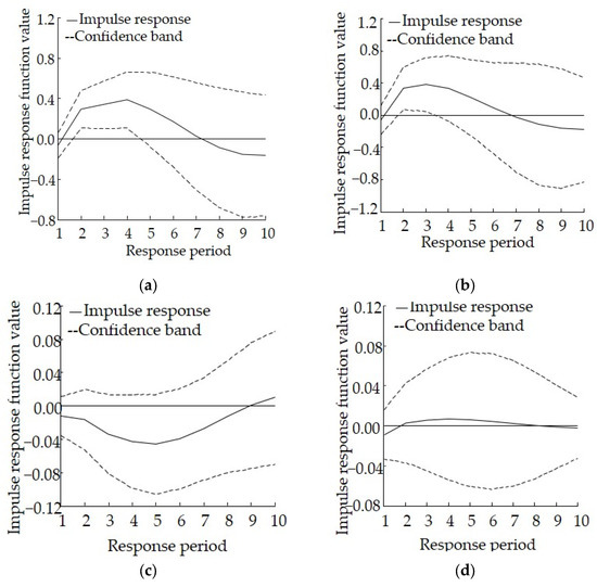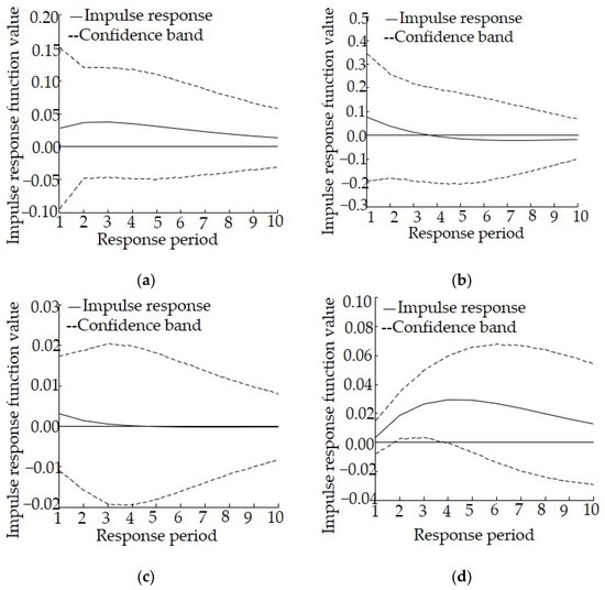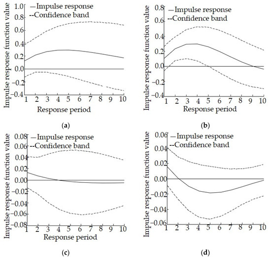Figure 5. As far as the impulse response of lnCOD to 1 unit of lnSI is concerned, the impulse response curve is always above the 0 axis, and the overall response path is relatively flat with small fluctuations, suggesting that industrial structure adjustment can help reduce the discharge of COD. As far as the impulse response of lnSI to 1 unit of lnCOD is concerned, the values during the first three periods are slightly positive, gradually decrease, and then essentially coincide with the 0 axis in the subsequent periods, suggesting that the discharge of COD imposes a weak positive effect on industrial structure adjustment during the early stages. As far as the impulse response of lnAN to 1 unit of lnSI is concerned, the values during the first four periods are positive and thereafter display a declining trend. All values become negative after the fourth period, suggesting that industrial structure adjustment can help reduce the discharge of AN in the early stages, but this reduction effect diminishes and rapidly disappears. As far as the impulse response of lnSI to 1 unit of lnAN is concerned, all values fluctuate above 0, suggesting that the discharge of AN imposes a certain positive effect on industrial structure adjustment.