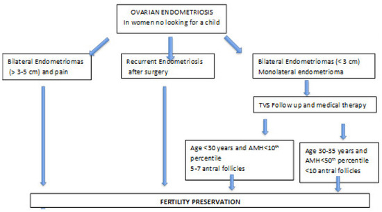 - Garcia-Velasco, J.A.; Somigliana, E. Management of endometriomas in women requiring IVF: To touch or not to touch. Hum. Reprod. 2009, 24, 496–501. [Google Scholar] [CrossRef]
