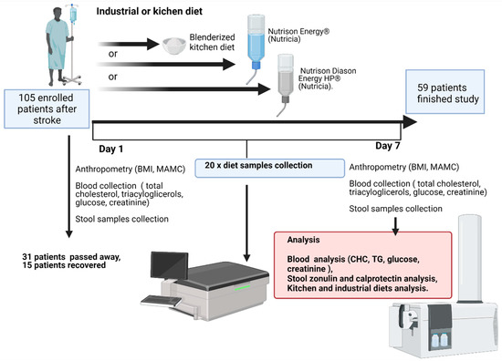 The intestinal barrier consists of a single layer of epithelial cells (mainly enterocytes) connected by tight junctions (TJ), which seal the intercellular space [1] Absorption in the intestinal epithelium is highly selective. Such selective absorption is an unquestionable advantage of the intestinal barrier and it is closely linked to its complex structure. Dysfunction of the intestinal barrier, or intestinal hyperpermeability, also known as the leaky gut syndrome, involves the loosening of TJ secondary to gut microbiota alterations [2]. A biomarker of the intestinal barrier integrity is protein-zonulin, which reversibly regulates intestinal permeability by modulating intercellular TJ. In contrast, fecal calprotectin is a useful marker of intestinal inflammation. This protein is secreted extracellularly from neutrophils related to calprotectin [3,4]. There is a body of evidence that gut integrity in critically ill patients, including those who experienced a stroke, is impaired, which might deteriorate the healing process to a large extent [5]. Stroke patients who are unconscious or have significant difficulties in swallowing should be subjected to enteral nutrition. Enteral nutrition diets might be of a kitchen variety (also called a blended diet or a home diet) or the industrial type [6]. To date, there have been few studies evaluating the effects of enteral nutrition on intestinal barrier function.