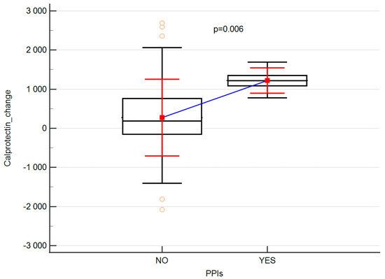 In the next stage of analyses, we evaluated whether the intake of drugs, commonly known to diminish gut barrier integrity parameters (proton pump inhibitors, antibiotics) might influence the results. We were able to show that calprotectin change was significantly affected by use of proton pump inhibitors (Table 4; Figure 3).