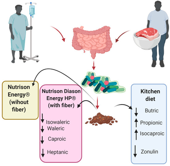 In this study, changes in SCFAs were observed only in the patients fed with a kitchen diet—when re-examining the results, we observed changes in the content of butyric and propionic acids only among these stool probes. This finding confirms the positive effect of dietary fiber on the synthesis of SCFAs [37] but in contrast to our results, we did not observe a positive effect of fiber-enriched enteral nutrition on SCFAs synthesis like Schneider et al. [38].
