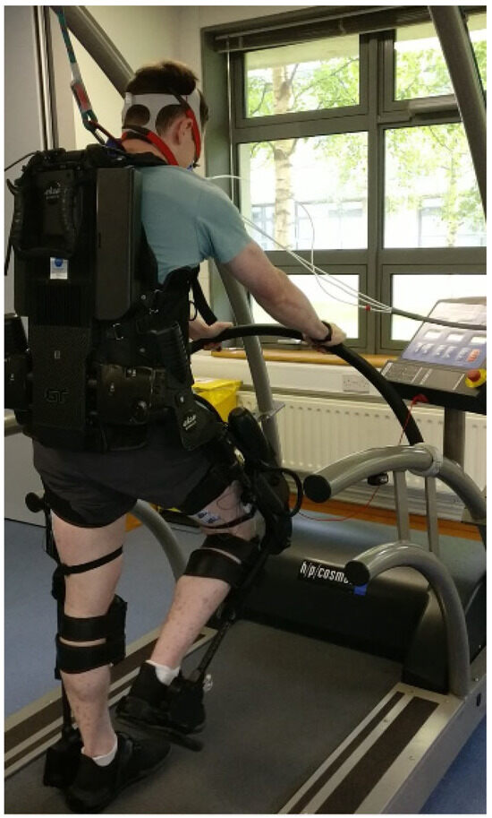 Both walking bouts, i.e., with and without the exoskeleton, were completed at the same fixed speed during the 12 min progressive treadmill assessment, which consisted of three consecutive four-minute phases at 1, 2, and 3 km·h−1. Four minutes of walking were selected at each speed to ensure participants reached a steady-state plateau in response to an increase in exercise intensity [28]. As the participants were able-bodied, the Ekso GT™ was in the most active mode throughout to enable participants to move freely without assistance from the exoskeleton. To prevent accidental falls, participants wore an overhead harness during both walking bouts. It was also necessary for participants to hold onto the front rail of the treadmill when using the exoskeleton for health and safety reasons. Therefore, participants also held onto the front rail when walking without the exoskeleton to accurately replicate and standardise walking protocols. Submaximal tests were selected to ensure they were safe and replicable within a neurologically compromised cohort.