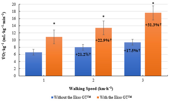 Mean volume of oxygen consumption per kilogram of body mass O2·kg−1; mL·kg−1·min−1) results during treadmill walking both with and without the Ekso GT™. * Significantly greater (p ≤ 0.05) when walking with Ekso GT™ versus walking without Ekso GT™. † Mean percentage O2·kg−1 increase at each walking phase, both with and without Ekso GT™.