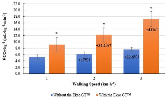Mean volume of carbon dioxide per kilogram of body mass CO2·kg−1; mL·kg−1·min−1) results during treadmill walking both with and without Ekso GT™. * Significantly greater (p ≤ 0.05) when walking with Ekso GT™ versus walking without Ekso GT™. † Mean percentage CO2·kg−1 increase at each walking phase, both with and without Ekso GT™.