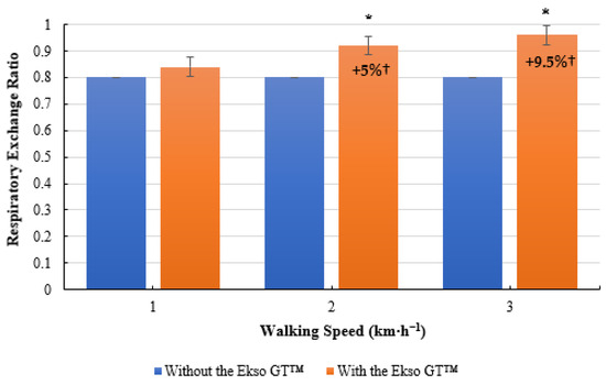 Mean respiratory exchange ratio (RER) results during treadmill walking with and without Ekso GT™. * Significantly greater (p ≤ 0.05) when walking with Ekso GT™ versus walking without Ekso GT™. † Mean percentage RER increase at each walking phase both with and without Ekso GT™.