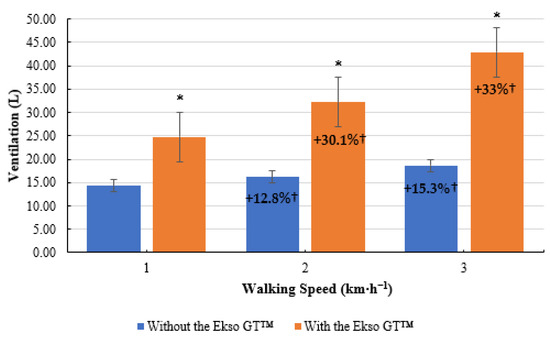 Mean ventilation (E) results during treadmill walking both with and without Ekso GT™. * Significantly greater (p ≤ 0.05) when walking with Ekso GT™ versus walking without Ekso GT™. † Mean percentage E increase at each walking phase with and without Ekso GT™.