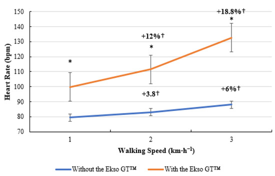Heart rate (HR; bpm) data during treadmill walking with and without Ekso GT™. * Significantly greater (p ≤ 0.05) when walking with Ekso GT™ versus walking with Ekso GT™. † Mean percentage HR increase at each walking phase with and without Ekso GT™.