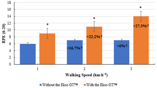 RPE scores were significantly greater during treadmill walking with the Ekso GT™ (9 ± 1, p = 0.011; ES = 0.8, large) compared to treadmill walking without the Ekso GT™ (6 ± 1) at 1 km·h−1. When walking at 2 km·h−1, RPE results were significantly higher during exoskeleton treadmill walking (11 ± 2, p = 0.011; ES = 0.8, large) in comparison to non-exoskeleton treadmill walking (7 ± 1). A significant difference was also present between RPE scores when walking with the Ekso GT™ (14 ± 1, p = 0.011; ES = 0.9, large) versus walking without the Ekso GT™ (7 ± 2) at 3 km·h−1. A greater mean RPE percentage increase was present between 1 km·h−1 and 2 km·h−1 when walking with the Ekso GT™ (22.2%) compared to walking without the Ekso GT™ (16.7%). A further increase of 27.3% was present between 2 km·h−1 and 3 km·h−1 when walking with the Ekso GT™; no increase in RPE scores was observed between 2 and 3 km·h−1 when walking without the Ekso GT™ (Figure 7).