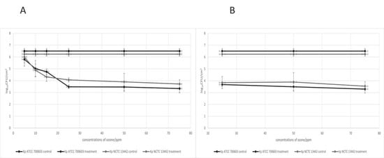 where represents the average of all CFU/cm2, ATP bioluminescence and CV measurements, after treatment with 25 ppm ozone during 1 h exposure, while represents the average of all measurements obtained from CFU/cm2, ATP bioluminescence and CV on the control group (Table S2). All inhibition rates were separately calculated for each method used (CFU/cm2, ATP bioluminescence and CV).
