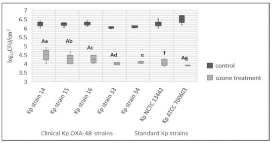 Total bacteria count expressed as log10 CFU/cm2 of 7 tested strains of Klebsiella pneumoniae (Kp). Results shown with median value (-) and minimum and maximum value. The lowercase letters, a–g, express the statistically significant difference between the treated and control group for the 7 tested strains (Mann–Whitney U test, p < 0.05). The capital letter A marks the statistically significant difference between Kp ATCC 700603 and OXA-48-producing strains Kp strain 14, Kp strain 15, Kp strain 16 and Kp strain 33, and vice versa (Kruskal–Wallis test, p < 0.05).