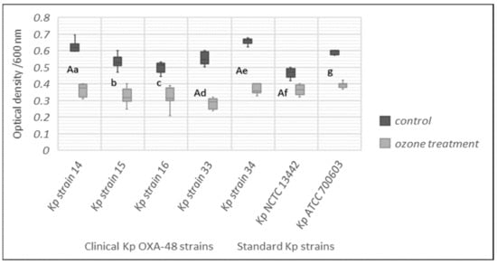 Biomass determination (CV staining) for control and treated K. pneumoniae strains (Kp) after treatment of 24 h biofilm with 25 ppm of ozone for 1 h. Results shown with median value (-) and minimum and maximum value. Lowercase letters, a–g, express the statistically significant difference between the treated and control group for the 7 tested strains (Mann–Whitney U test, p < 0.05). The capital letter A marks the statistically significant difference between strains Kp ATCC 700603, Kp strain 14, Kp strain 33, Kp strain 34 and Kp NCTC 13442, and vice versa (Kruskal–Wallis test, p < 0.05).