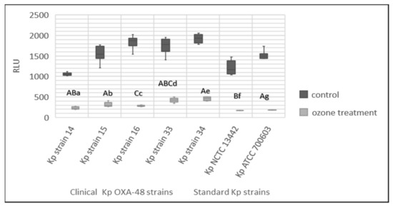 Bacterial biomass measured using the ATP bioluminescence method showed a statistically significant (p < 0.05) reduction in biomass after treatment with ozone for all K. pneumoniae strains in comparison to the control group (Figure 5). Significant difference between different K. pneumoniae strains was observed (p < 0.05).