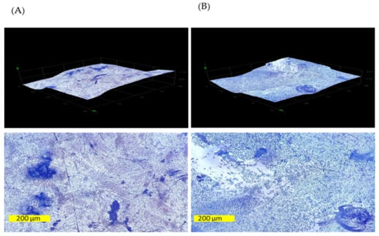 The three-dimensional (above) and two-dimensional (below) images of ceramic tiles surfaces inoculated with representative strain K. pneumoniae NCTC 13442 biofilm: control sample (A) and ozone-treated sample (B). The dark blue stains present the bacteria stained with crystal violet.