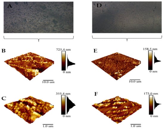 Atomic force microscopy of representative strain K. pneumoniae NCTC 13442 biofilm on ceramic tiles. Topology of biofilm created after 24 h (A–C) and topology of biofilm treated with 25 ppm of ozone for 1 h (D–F). Scanning area for (B,E) is 10 µm × 10 µm and for (C,F) is 1 µm × 1 µm.