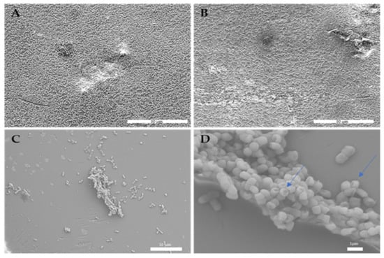 The treated representative strain K. pneumoniae NCTC 13442 biofilm showed some morphological changes, such as the recesses area in the biofilm’s three-dimensional topology (A–B) (Figure 8). Moreover, changes in the bacterial cell wall were observed. The ozone treatment damaged the bacterial cells, causing invagination to their membrane (Figure 8D).