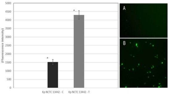 A significant increase of 182% of ROS levels determined by the fluorescent dye was observed for the representative strain K. pneumoniae NCTC 13442 biofilm (Figure 10 left). Fluorescence microscopy images indicate oxidative stress in representative strain K. pneumoniae NCTC 13442 biofilm treated with 25 ppm of ozone for 1 h (Figure 10A,B).