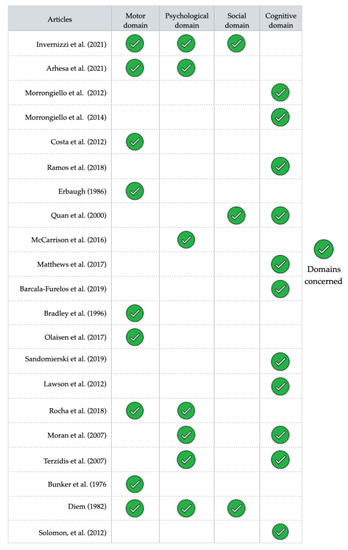 The outcomes measured in children analysis concerned the motor (n = 9), psychological (n = 5), cognitive (n = 5), and social (n = 2) dimensions. Only two studies covered three dimensions: motor, psychological, and social [43,55]. The types of effects measured in the parent studies were cognitive (n = 7), psychological (n = 3), and social (n = 1). Figure 2 synthesizes the domains explored by each studies reviewed.