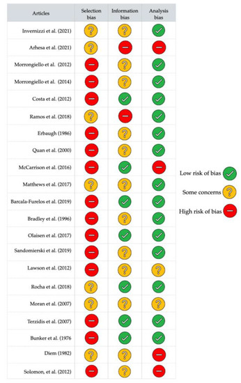 Figure 3 shows the adapted risk of bias grid of Cochrane [39], of the 21 articles selected. None had a low risk of bias for both selection, information, and analysis. None presented a low selection risk. Only one article performed a selection by randomisation [60], and six had a dropout lower than 20 percent [43,44,46,49,55,62]. Seven had a lower information bias. Three did not consider the baseline values [44,47,60] and half performed a blinded intervention [45,47,48,49,50,52,53,54,58,59,60]. Regarding the statistical bias, two had a medium risk of analysis [51,62] and four had a high risk [44,55,56,59]. Finally, six articles had low risk of bias for information and analysis but high to medium risk of bias for population selection [45,48,50,52,53,54].
