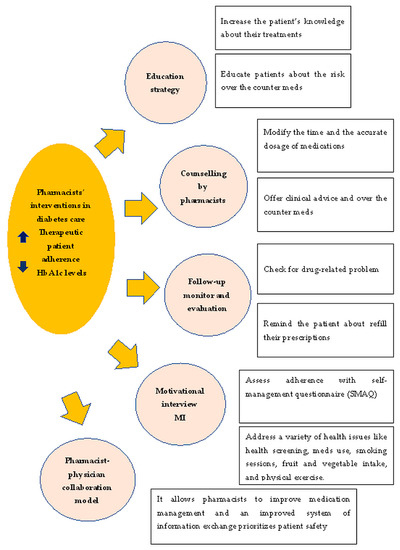 - Coutureau, C.; Slimano, F.; Mongaret, C.; Kanagaratnam, L. Impact of Pharmacists-Led Interventions in Primary Care for Adults with Type 2 Diabetes on HbA1c Levels: A Systematic Review and Meta-Analysis. Int. J. Environ. Res. Public Health 2022, 19, 3156. [Google Scholar] [CrossRef] [PubMed]